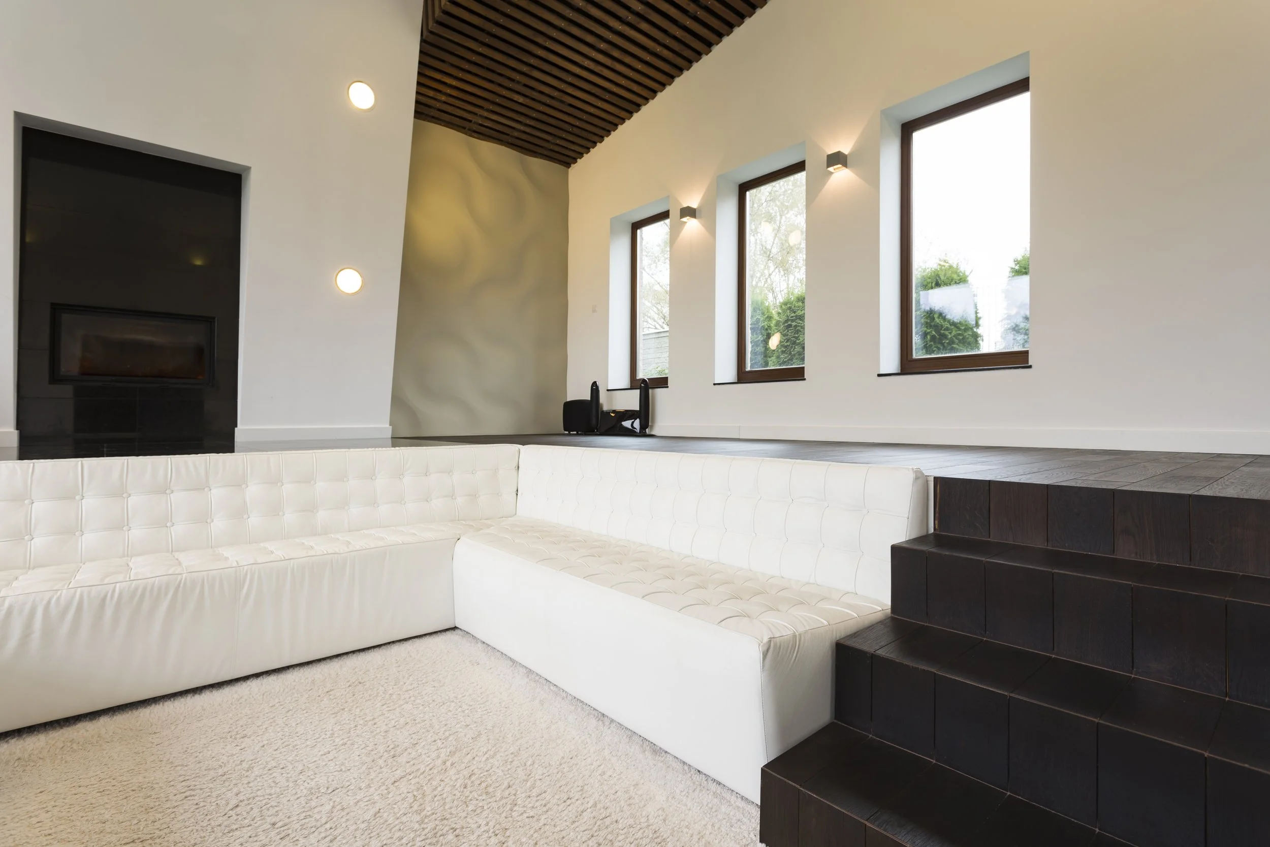 "Our living room feels like a masterpiece after the remodel! The abundant natural light and recessed flooring create such a unique and open atmosphere, and the slatted wood ceiling is a true showstopper!"